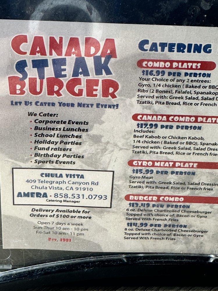 Welcome to Canada Steak Burger, a delightful fusion restaurant located at 409 Telegraph Canyon Rd in Chula Vista, CA. This eatery serves up a diverse menu that spans Greek specialties, cheesesteaks, and classic burgers, ensuring something for everyone.
